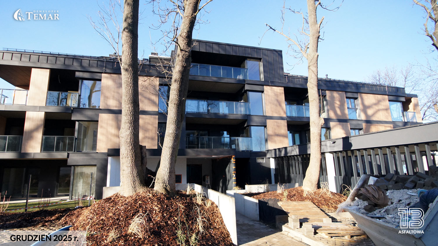 Przed budynkiem wśród okazałych wieloletnich jesionów znajdą się nasadzenia zieleni niskiej i krzewów oraz parkowe ławki i stojaki na rowery. Indywidualny projekt aranżacji części wspólnych, zostanie dopasowany do charakteru budynku, a każde mieszkanie będzie posiadać ogródek, balkon lub taras, co zapewni relaks i dobre samopoczucie.
